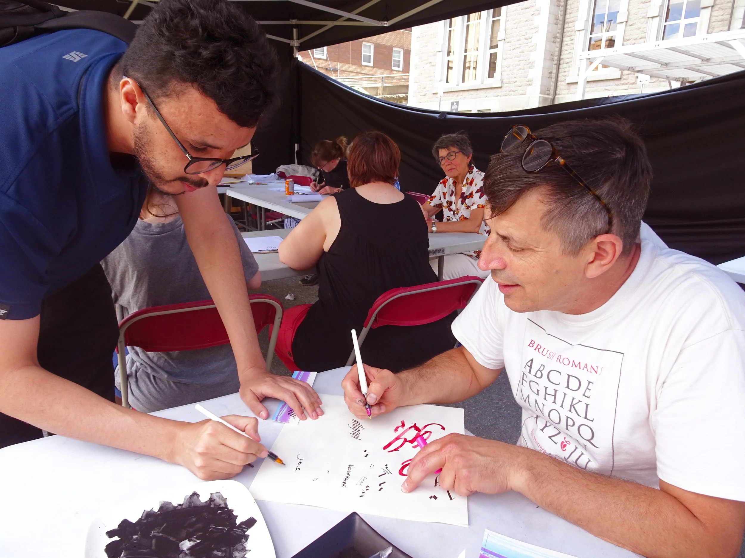 À 15 h, Yolande a commencé son cours d’initiation à l’onciale avec l’assistance de Diane. Une famille s’est présentée en plus de cinq autres personnes. Aux signets, Martin et moi avons calligraphié quelques prénoms. C’est alors qu’une rencontre spéciale a eu lieu : Omar, un jeune homme d’origine arabe est arrivé. Martin a calligraphié son prénom en italique, inspirée de l’Autrichien Friedrich Neugebauer. Puis Omar a écrit en arabe son prénom, de droite à gauche. J’étais ravie d’assister à un tel échange !