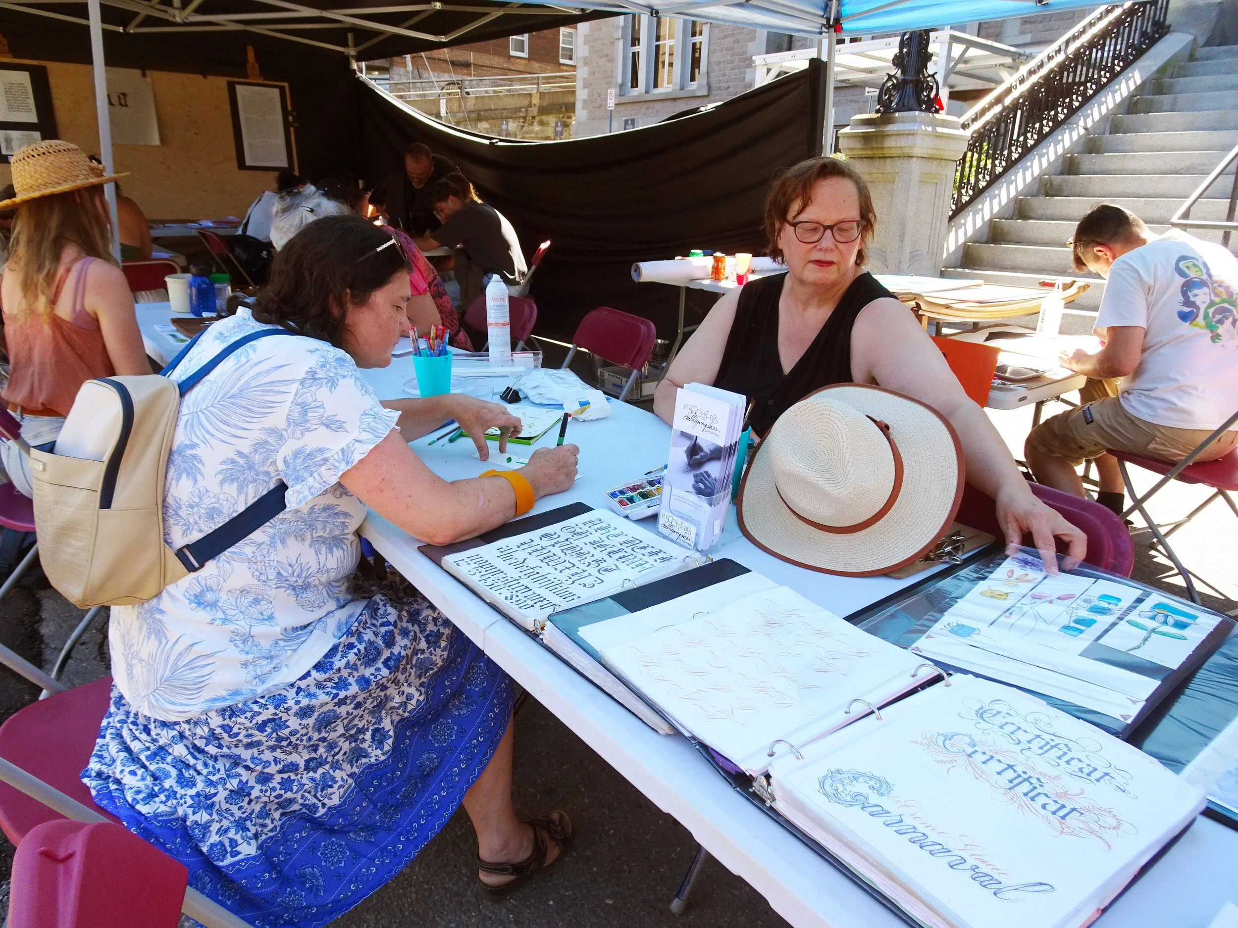 Pendant ce temps, sous le deuxième chapiteau, Yolande calligraphiait des signets avec de l’anglaise. À côté d’elle, Diane aidait les gens à ajouter une touche personnelle sur leur signet avec des feutres-pinceaux multicolores. Pour sa part, Martin a sorti ses pinceaux pour faire deux affiches afin de mieux signaler notre présence alors que nous étions situés tout près de l’hôtel de ville, en haut du carré Strathcona.