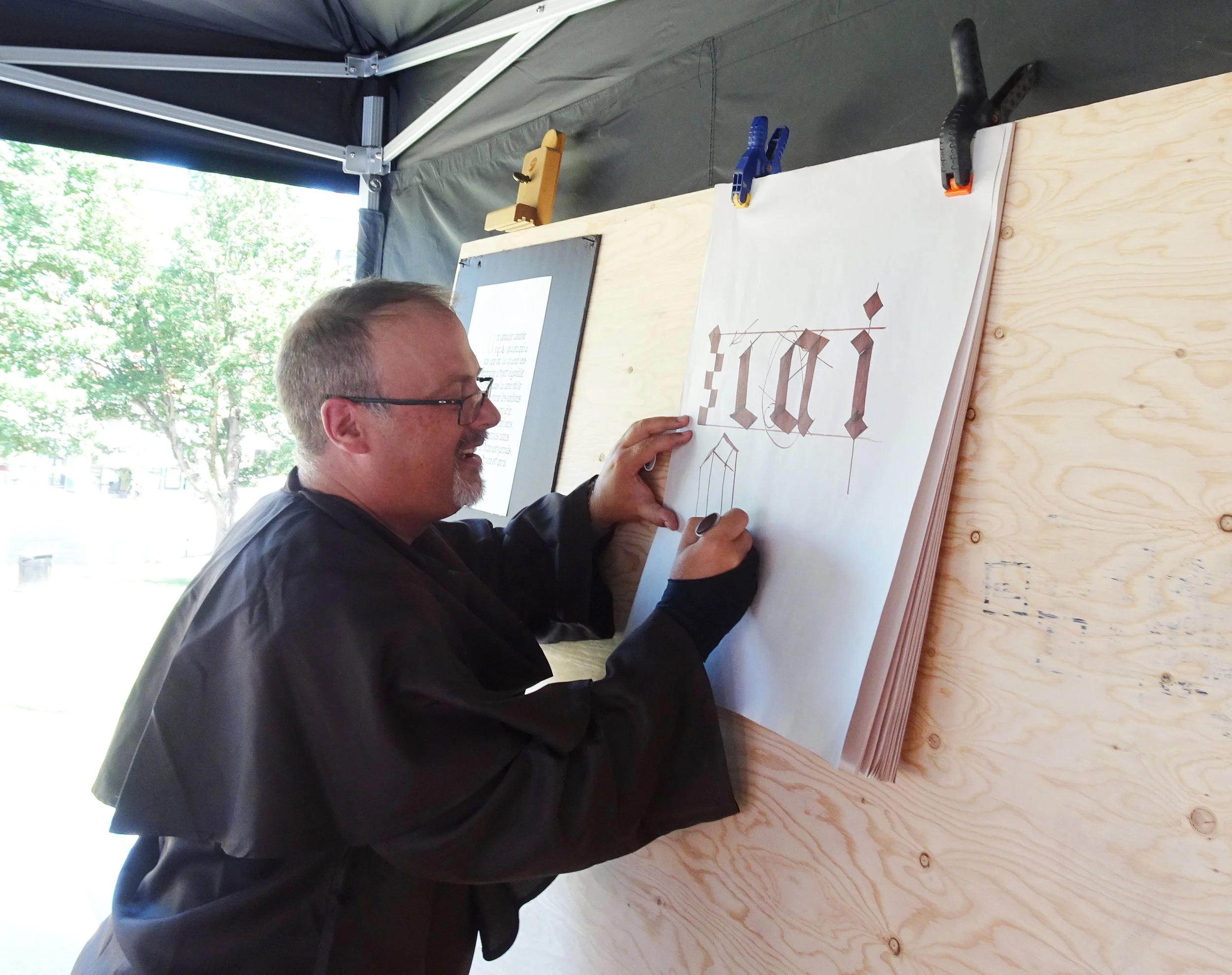 Dès 13 h, alors que nous étions protégés du soleil par deux chapiteaux, Sachas, vêtu de sa soutane, a commencé son cours d’initiation à la gothique textura quadrata. Trois personnes, dont un gaucher, se sont assises et c’était parti ! Quelques minutes plus tard, une famille s’est ajoutée et c’était vraiment beau de les voir calligraphier avec une telle facilité cette gothique.